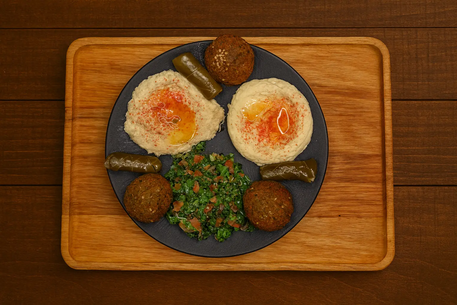 Homemade hummus, baba ghanouj, tabouli, falafel, and hand-rolled grape leaves
